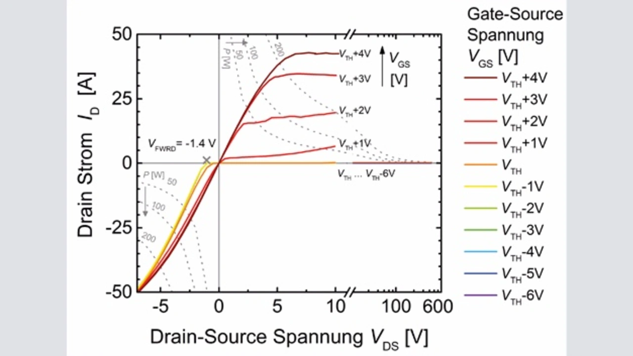 Das Rückwärtsverhalten im dritten Quadranten der Ausgangskennlinie ähnelt dann einer Freilaufdiode, wobei die Vorwärtsspannung dieser Diode von der Gate-Source-Spannung abhängig ist (Bild 3). Die Vorwärtsspannung dieser Quasi-Freilaufdiode errechnet sich aus UF = UGS – Uth. Im Durchlassbetrieb, wenn die Gate-Source-Spannung größer als die Schwellspannung Uth ist, ist der Transistor ohnehin offen, sowohl im Vorwärts- als auch im Rückwärtsbetrieb. Üblicherweise erfolgt aber die Rückleitung aus dem Sperrbetrieb zum Beispiel als Freilauf bei einer induktiven Last. Das heißt die Gate-Source-Spannung ist kleiner als die Schwellspannung und der Transistor schaltet in einen verlustbehafteten Rückwärtsbetrieb. Er zeigt dabei ein Diodenverhalten mit hoher Vorwärtsspannung. In der HEMT-Struktur entstehen die Verluste dabei lokal am Gate-Kontakt. Dies kann das Bauelement im Dauerbetrieb zerstören oder die Zuverlässigkeit reduzieren. Dies lässt sich auf unterschiedliche Weise verhindern: