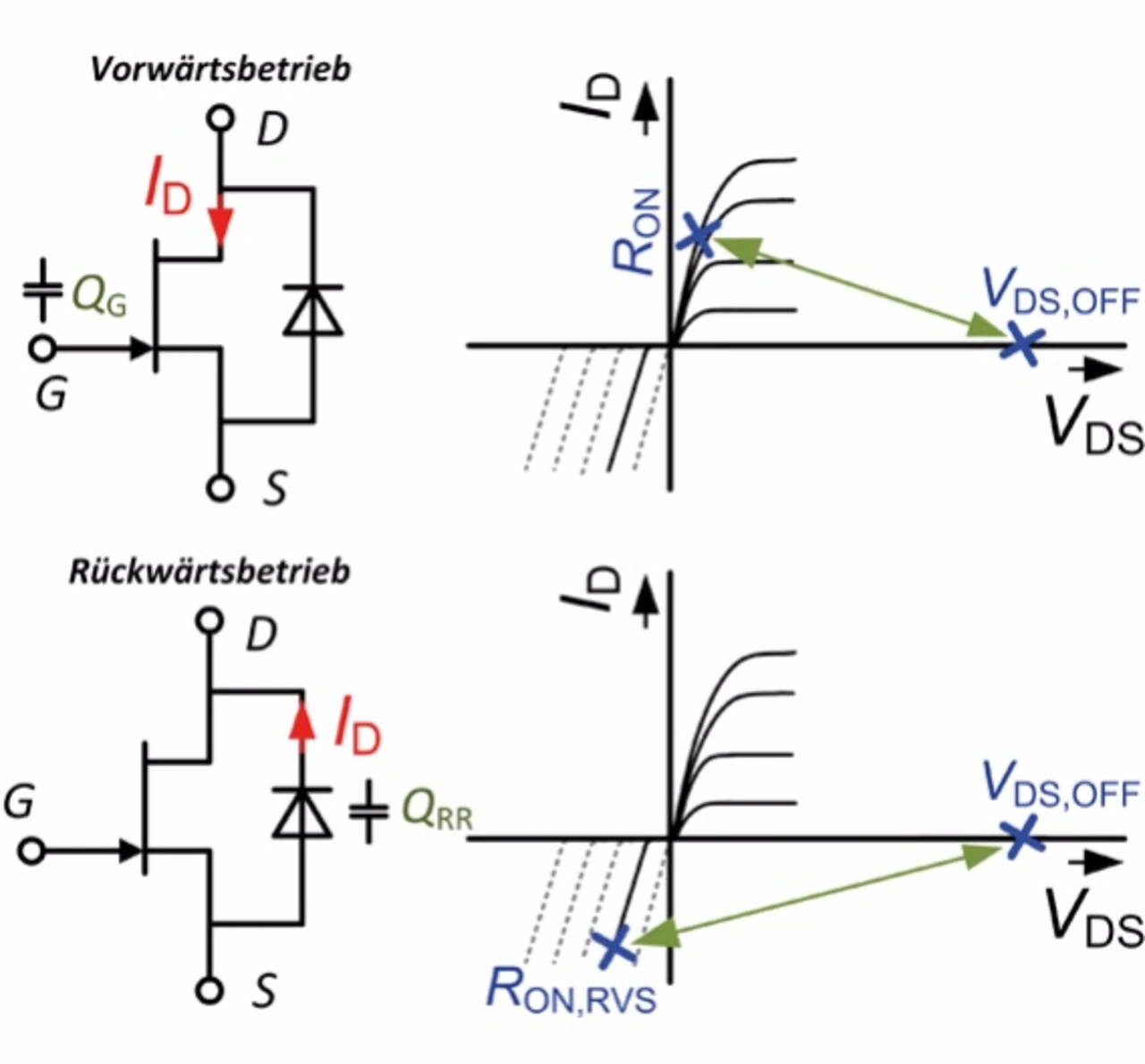 GaN-Transistoren haben keine Body-Diode im Rückwärtsbetrieb wie Silizium-Power-MOSFETs, wo diese technologiebedingt inhärent vorhanden ist. Jedoch benötigen die meisten Schaltwandler-Topologien so eine antiparallele Diode. Doch auch bei GaN-Transistoren gibt es ein nutzbares Rückwärtsverhalten.