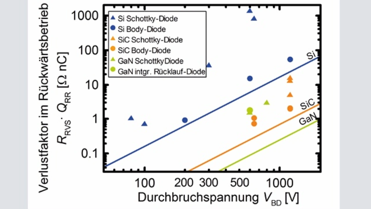 Analog zum Vorwärtsbetrieb kann man auch für den Rückwärtsbetrieb das Produkt aus dem Durchlasswiderstand und der Schaltladung als Leistungskennzahl nutzen. Das Produkt RON,RVS ∙ QRR besteht in diesem Fall aus dem Durchlasswiderstand im Rückwärtsbetrieb und der Ladungsmenge, die für den Schaltvorgang nötig ist. Ein Vergleich unterschiedlicher Freilaufdioden zeigt Bild 6, wo der Verlustfaktor RON,RVS ∙ QRR sowohl von Body-Dioden als auch von Einzeldioden dargestellt ist. Im Vergleich zu Si-Bauelementen erreichen GaN- und SiC-Chips deutlich kleinere Werte. Die Unterschiede sind bemerkenswert. In der 600-V-Klasse erzielen GaN und SiC 500 bis zu 1000-mal niedrigere Werte im Vergleich zu den Si-Body-Dioden von Leistungs-MOSFETs und bis zu 10-mal niedrigere Werte im Vergleich zu Si-Schottky-Dioden.
