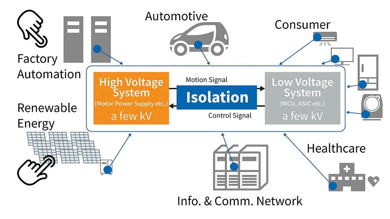 In zahlreichen Anwendungen sind Schaltungen für Hoch- und Niedervoltspannungen zuverlässig voneinander zu trennen und gleichzeitig eine schnelle Kommunikation mit hochfrequenten Signalen zwischen den Subsystemen zu ermöglichen. Das stellt besondere Anforderungen an die Isolatoren.