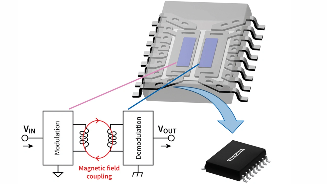 Ein Beispiel dafür ist die von Toshiba Electronic Devices & Storage entwickelte »DCL54x01-Serie«. Dabei handelt es sich um einen digitalen Isolator, der aus zwei integrierten Chips zum Modulieren und Demodulieren des Signals besteht. Jeder dieser beiden Chips verfügt über Transformatoren für die galvanische Isolation. Pro Kanal stehen somit zwei Transformatoren zur Verfügung, die so eine doppelte Isolation bilden. Das Ergebnis ist eine hochintegrierte Isolierung, sodass der DLC54x01 auch in Hochspannungs- und Hochstromumgebungen einen sicheren Betrieb gewährleistet und Schutz vor Spannungsspitzen von bis zu 12,8 kV bietet; diese Eigenschaft wurde in Tests gemäß Vorgaben der IEC61000-4-5 nachgewiesen.