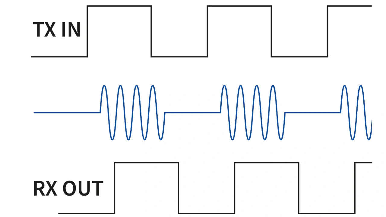 Der DCL54x01 verwendet für die Signalübertragung ein spezielles On-off-Keying-Modulationsverfahren, bei dem High- und Low-Level-Zustände über die An- und Ausschaltung des Trägersignals dargestellt werden. Diese digitale Signalisierungsmethode bietet eine größtmögliche Zuverlässigkeit, auch bei der Übertragung von Daten mit einer Geschwindigkeit von 100 Mbit/s und darüber hinaus. PWM-Signale (Pulsweitenmodulation) und andere Hochgeschwindig-keitssignale können über das On-off-Keying-Verfahren der neuen Digital-isolatoren von Toshiba mit einer Pulsbreitenverzerrung von weniger als 3 ns übertragen werden.