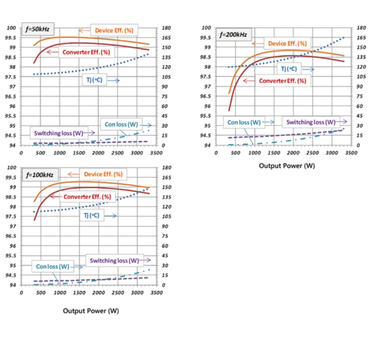 Bei 100 kHz bedeutet der hohe Wirkungsgrad des Bauelementes von über 99 % bis zur Volllast eine Gesamtverlustleistung von nur 28 W bei einer Ausgangsleistung von 3,4 kW. Dies führt zu einer Sperrschichttemperatur von +76 °C. Die Bauelementephysik zeigt, dass die Schaltverluste für jeden Halbleiter bei höheren Frequenzen ansteigen. Die Vorteil von GaN besteht darin, dass sich diese Verluste zu weitaus höheren Frequenzen hin zu verschieben und die Verlustleistung gleichzeitig ausreichend niedrig bleibt, um Überhitzungen zu vermeiden. Die GaN-Halbbrücke arbeitet problemlos bei 3,4 kW und 300 kHz mit einer Sperrschichttemperatur von +140 °C, die weit unter der Spezifikationsgrenze von +175 °C liegt. Im Vergleich zu herkömmlichen Si-Bauelementen bei 12 kHz bis 50 kHz, eröffnen die GaN-Transistoren große Entwurfsspielräume für Entwickler kompakter Leistungsschaltungen.