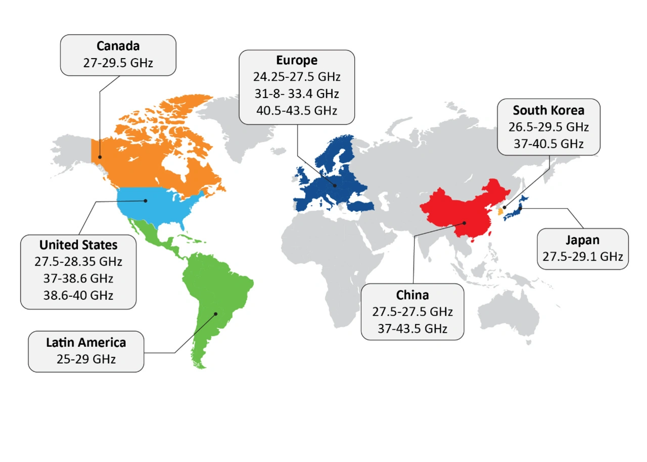 Die einzelnen Länder arbeiten bei 5G in unterschiedlichen Bändern des Millimeterwellen-Bereichs (mmWave-Band). In den Vereinigten Staaten war 28 GHz das erste 5G-mmWave-Band, das zum Einsatz kam, gefolgt von 39 GHz. China setzt 5G mmWave bei Frequenzen im Bereich 24,25 bis 27,5 GHz ein und ist bei der Einführung von 5G mmWave im Rückstand.