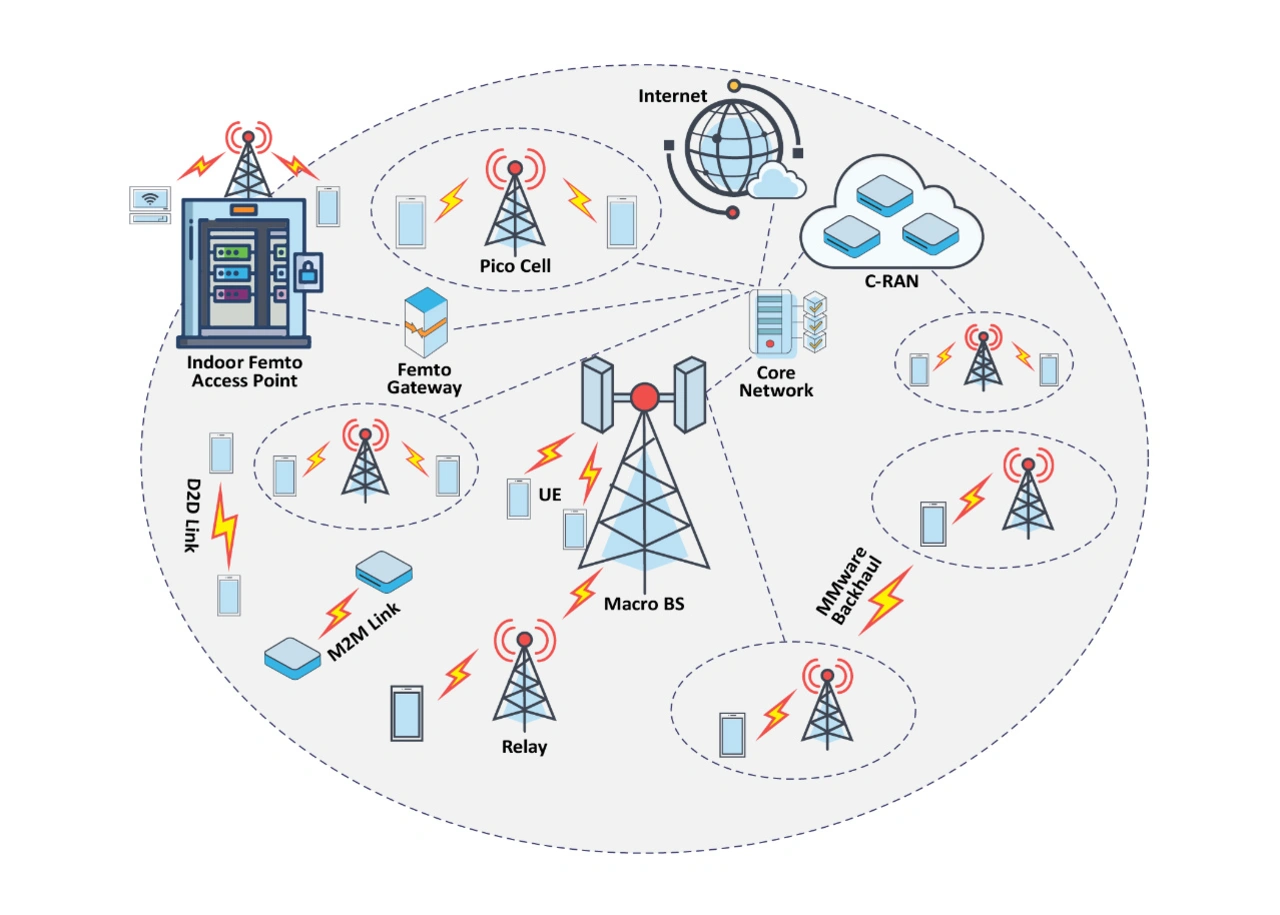 Das 5G-Netz besteht aus Makro-Basisstationen und kleinen Zellen. Die Makro-Basisstation ist über mmWave-Backhaul- oder Glasfaserverbindungen mit dem Kern-Netzwerk verbunden. Makro-Basisstationen können direkt mit den Mobiltelefonen bzw. Endgeräten kommunizieren, aber sie ermöglichen auch die Kommunikation mit den kleinen Zellen, die wiederum mit den Mobil- bzw. Endgeräten kommunizieren und so die Verbindung auf der letzten Meile sicherstellen. Es gibt Pico-Zellen und Femto-Zellen, die jeweils die Netzanbindung innerhalb von Bürogebäuden zur Verfügung stellen, in denen die Verbindung schwach sein kann oder wo eine hohe Nutzerdichte besteht.
