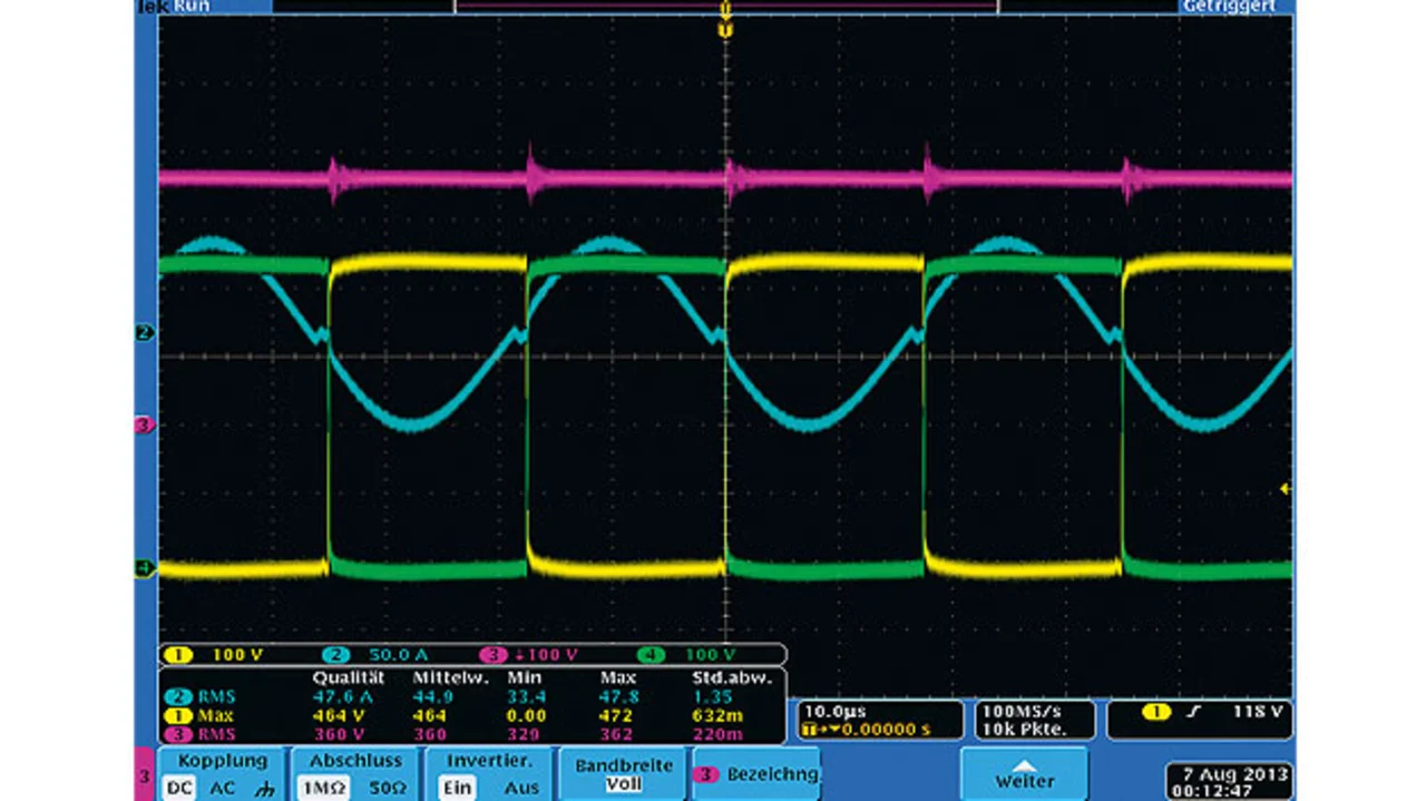 Erste Messungen an der Station zeigen den Erfolg beim entlasteten Schalten; Bild 5 ist eine Aufnahme der Verläufe der Gate-Signale der H-Brücke und des Stromes im Trenn-Transformator. Die Messung verdeutlicht, dass noch weitere Optimierung bei der Abstimmung der Resonanzfrequenz und der Stromnulldurchgänge möglich ist. Sie stellt aber auch den Erfolg bei der Verringerung der Schaltverluste dar, da nur bei sehr kleinem Strom Schalthandlungen stattfinden. Der im Labor ermittelte Wirkungsgrad der Trennstrecke erreicht mit über 97 % den erwarteten Wert.