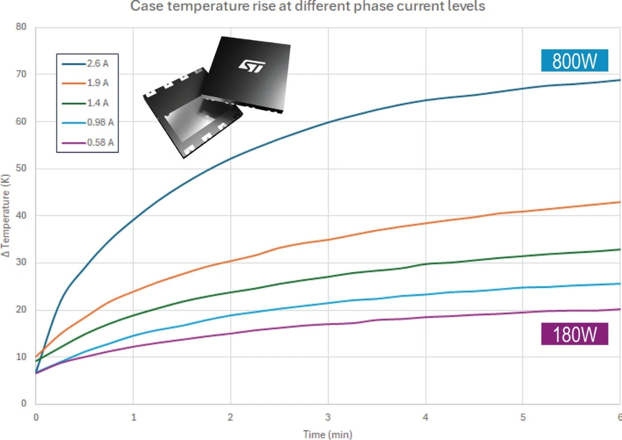 In der Grafik verdeutlichen die Kurven die Gleichmäßigkeit und das niedrige Temperaturniveau von GaN-Bauelementen. So hat der Prüfling in diesem Beispiel einen RDS(on)-Wert von 80 mΩ, und der Motor-Inverter arbeitet mit einer Schaltfrequenz von 16 kHz sowie einem maximalen dV/dt-Wert von knapp 10 V/ns. Eine Leistung von etwa 800 W ist ohne das Risiko des thermischen Durchgehens erreichbar. Die dabei entstehende Temperaturzunahme Δt beträgt weniger als 70 ˚C, sodass ein hinreichender Abstand zur maximalen Betriebs-Sperrschichttemperatur (TJmax) von 150 ˚C besteht. Dieses bemerkenswerte Resultat wird zudem ohne Kühlkörper erzielt. Vielmehr befinden sich die GaN-Bauelemente auf einer gemeinsamen zweilagigen Leiterplatte, die auch die Wärmeabfuhr übernimmt.