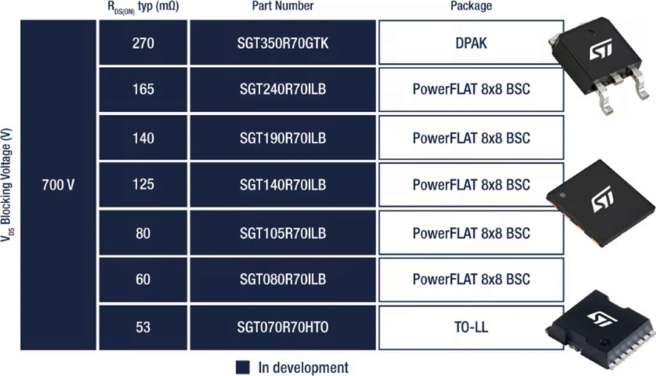 Bei den GaN-Transistoren der STPOWER-Familie handelt es sich um selbstsperrende p-GaN-Gate-Anreicherungstransistoren mit einer Sperrverzögerungsladung von null. ST bietet derzeit sieben Typen mit einer Nenn-Durchbruchspannung (VDS) von 700 V an, mit RDS(on)-Werten zwischen 270 mΩ und 53 mΩ in den Gehäusebauformen DPAK, PowerFLAT 8x8 und TO-LL. Durch neue Produkte wird das Portfolio außerdem zügig mit weiteren Gehäusetypen, RDS(on)-Werten und Durchbruchspannungen erweitert.