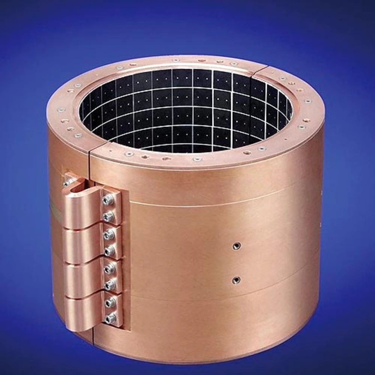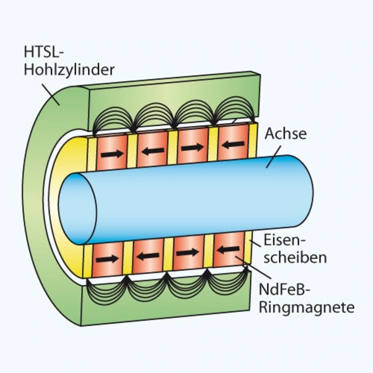 Dieses Problem entfällt beim HTS-Lager. Die Entwicklung stammt von Nexans; Bild 4 zeigt das Prinzip, Bild 5 den offenen Stator. Auf der Achse befinden sich mehrere ringförmige Permanentmagnete aus Neodym-Eisen-Bor, separiert durch Eisenscheiben, Außendurchmesser 317 mm.