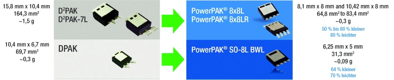 Im Vergleich zu herkömmlichen TO-Gehäusen erfordert das Design mit PowerPak-Gehäusen weniger Platz auf der Leiterplatte für MOSFETs. Für Hochleistungsanwendungen oberhalb des Kilowatt-Bereichs werden in der Regel mehrere MOSFETs mit großen Chips wie beispielsweise D2Paks benötigt.