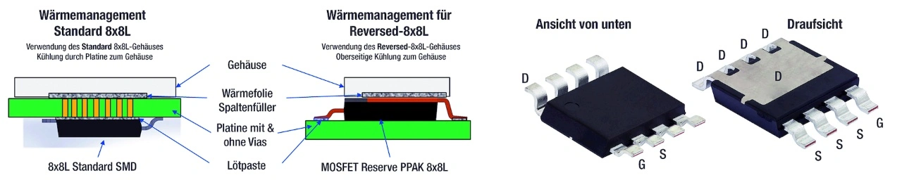 Das oberseitig gekühlte PowerPak 8x8LR hat eine etwas größere Grundfläche von 83,36 mm2 und benötigt dennoch 50 Prozent weniger Platz auf der Leiterplatte als ein D2Pak. Durch das freiliegende Drain Pad auf der Oberseite des Gehäuses kann die Wärme direkt nach oben zum Kühlkörper oder zum Modulgehäuse abfließen.