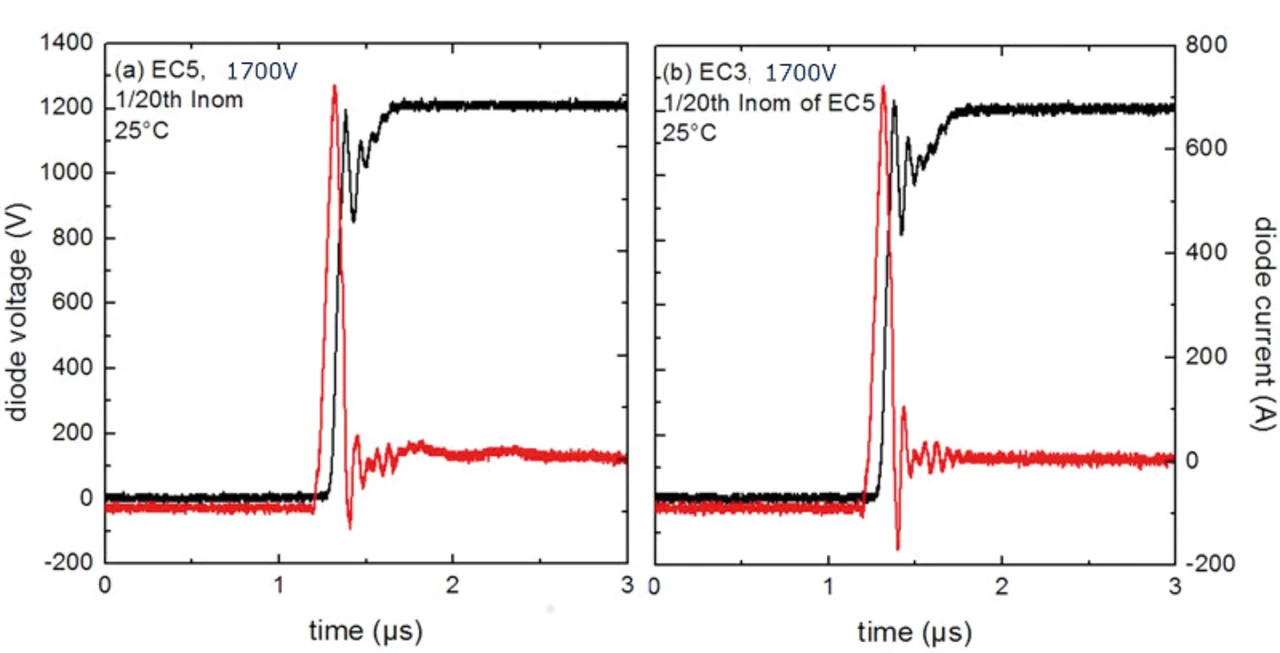 Abbildung 5 zeigt einen Vergleich der Kommutierungscharakteristiken der beiden Dioden-Generationen. Für die Bewertung der Softness wurde eine Messung im Teillastbetrieb bei niedrigem Kommutierungsstrom (I = 5% Inom) und niedriger Sperrschichttemperatur (Tvj = 25 °C) gewählt. Trotz der reduzierten Siliziumdicke, die ein ruppiges Kommutierungsverhalten zur Folge haben kann, sind die dynamischen Eigenschaften der Diode der 5. Generation vergleichbar mit der vorherigen Generation und damit auch für Hochstrom-Module geeignet. Für die hohe Stoßstromfestigkeit bei gleichzeitig um 25 K erweiterter Sperrschichttemperatur weist die neue Dioden-Generation auf der Vorderseite eine dicke Kupferbeschichtung auf, wie in Abbildung 4 dargestellt.