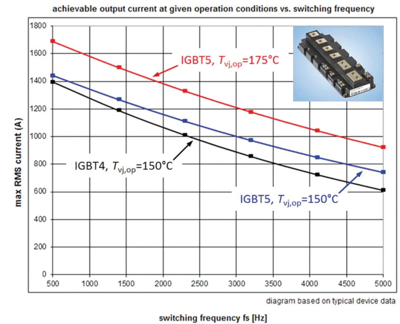 In Abbildung 6 sind die Ergebnisse der Berechnungen zusammengefasst. Dabei ist der erreichbare Ausgangsstrom als Funktion der Schaltfrequenz dargestellt. Die schwarze und blaue Kurve zeigen den berechneten Strom bei Tvj,op = 150 °C. Durch die rote Kurve wird der maximal erreichbare Ausgangsstrom des Umrichters mit IGBT5 bei TvjopMax = 175 °C dargestellt. Wie die Simulationsergebnisse zeigen, lässt sich mit der neuen IGBT5-Technologie der maximale Ausgangsstrom bei voller Ausnutzung um etwa 30% erhöhen. So zeigt die blaue Kurve den maximalen Ausgangsstrom der 5. Generation bei einer auf Tvj,op = 150 °C begrenzten Sperrschichttemperatur. Unter diesen Bedingungen verlängert die im Modul enthaltene .XT-Aufbau- und Verbindungstechnologie die Lebensdauer der Bauelemente deutlich, wobei der maximal erreichbare Ausgangsstrom immer noch um etwa 10% höher liegt als bei der vorherigen P4-Variante.