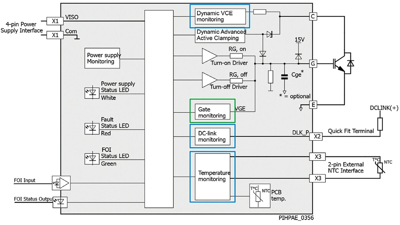 Zu den weiteren Merkmalen gehört ein Statusmonitor für die Glasfaserschnittstelle, der sicherstellt, dass die Schaltbefehle korrekt empfangen werden. Ebenso stellt die Gate-Überwachung sicher, dass die Schaltbefehle korrekt ausgeführt wurden und sich das Leistungsmodul im entsprechenden Betriebszustand befindet. Die Kurzschlussüberwachung sorgt für eine präzise Steuerung, sodass der Gate-Treiber im Falle eines Kurzschlusses angemessen reagieren kann.