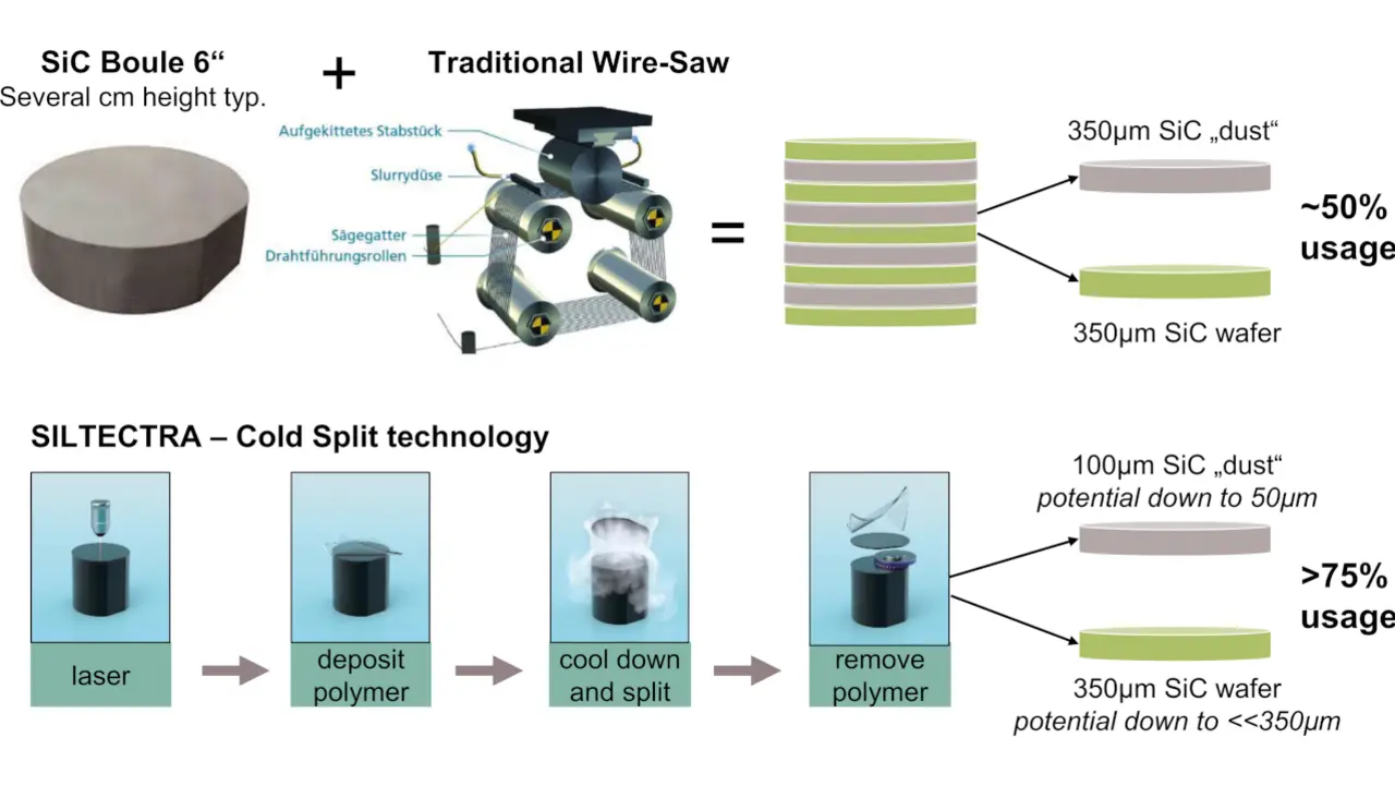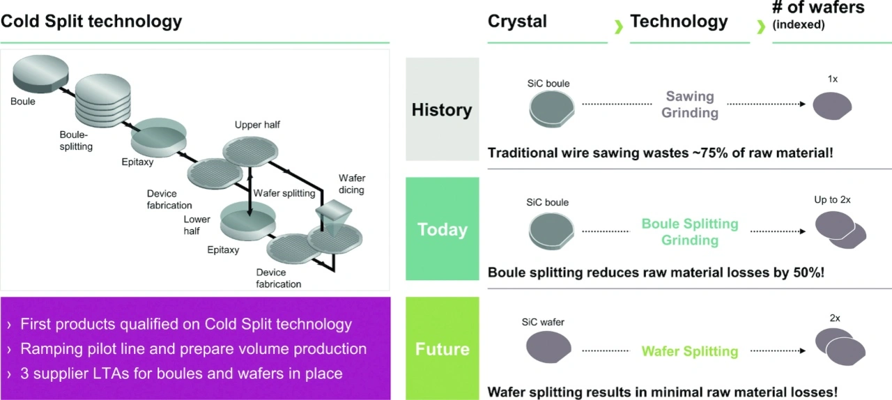 Korrekt. Der traditionelle SiC-Fertigungsprozess endet mit dem mechanischen Dünnen des Wafers durch Schleifen, bevor der Wafer in die einzelnen Chips zerschnitten wird. Anstatt den SiC-Wafer zu schleifen, wenden wir Cold Split an, um aus diesem normal dicken Wafer einen weiteren, dünneren Wafer zu gewinnen, den wir dann erneut prozessieren können. Auf diese Weise können wir die Anzahl der Wafer aus einer gegebenen Menge Basismaterial mit Standarddicke nochmals verdoppeln.