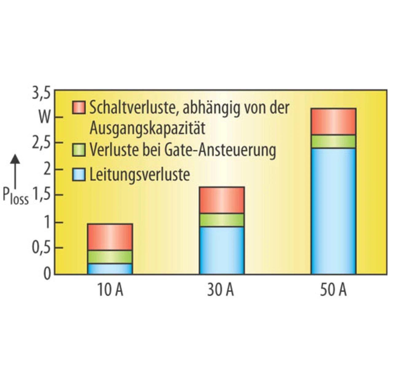 Ein Großteil der Verluste entsteht also gar nicht während der Phase der Stromleitung der Synchrongleichrichter-MOSFETs, sondern nur während der wenigen Nanosekunden der Ein- oder Ausschaltvorgänge. Woran dies liegt, ist recht einfach zu verstehen: Sowohl Gate-Ansteuerleistung als auch die Verluste durch die Ausgangskapazität sind nahezu ausgangsstrom-unabhängig, haben also über den gesamten Lastbereich einen konstanten Wert. Im Gegensatz dazu stehen die Leitendverluste: Diese steigen mit dem Quadrat des Stromes an und sind somit meist schon bei mittleren Ausgangsströmen dominierend.
