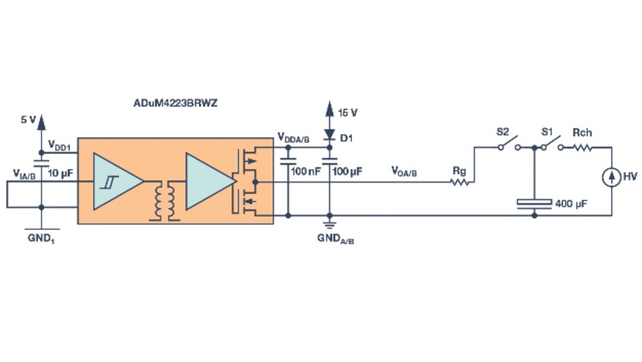 Für einen weiteren Test, der die Bedingungen im Extremfall simulierte, legten wir die zerstörende Energie direkt an die Ein- und Ausgangs-Chips des Gate-Treibers an. Während dieser Prüfung verbindet das Relais S2 den voll aufgeladenen 400-µF-Kondensator mit dem Ausgangs-Pin des Gates (Bild 4). Diese Prüfung generiert die größtmögliche Überbelastung, sodass sich damit die Widerstandsfähigkeit der Isolierung untersuchen lässt. Dabei fließt die Energie direkt in die Treiberschaltung, wobei der Gate-Widerstand das einzige Bauteil ist, das die Leistung begrenzt.