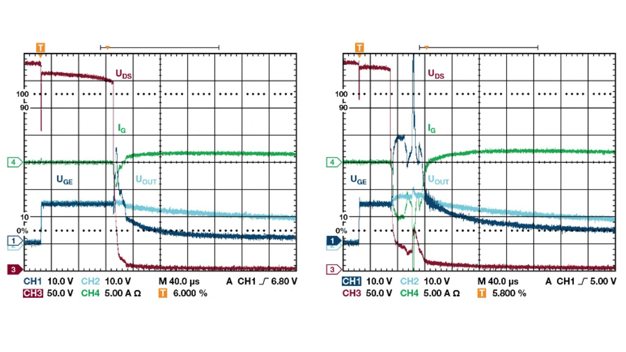 Die zerstörenden Prüfungen zeigten unterschiedliche Signalformen bei der Zerstörung der Leistungsschalter. Bild 6 zeigt links das Oszillogramm der Prüfung eines Superjunction-Mosfets. Die Zeitspanne zwischen Einschalten und Zerstörung betrug rund 100 µs. Dabei floss nur ein sehr begrenzter Strom in den Treiber-Chip, der die Überbelastung verkraftete. Bei gleichen Testbedingungen generierte ein Standard-Mosfet signifikant höheren Gate-Strom und Überspannung, sodass der Treiber zerstört wurde (Bild 6, rechts).