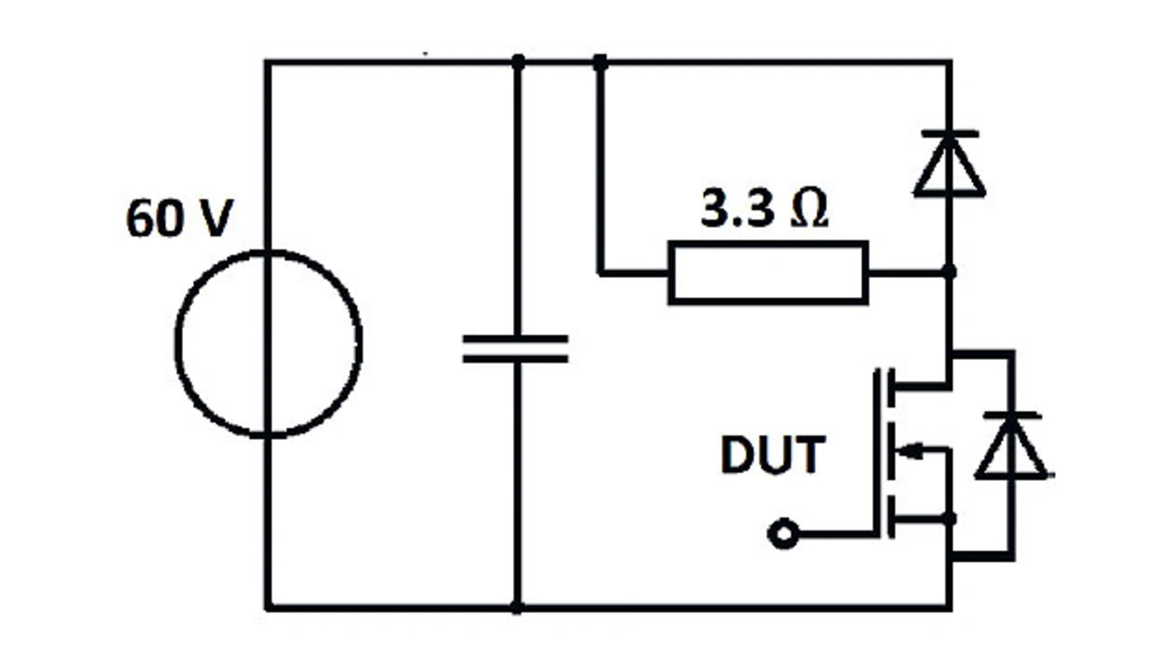 Für die Messungen wird das PD1500A so modifiziert, dass es mit dem Kalorimeter verwendet werden kann. Mit diesen Änderungen können nur Niederspannungs- tests durchgeführt werden, da das verfügbare Netzteil mit ausreichender Stromstärke nur 60 V liefern kann. Die Last für die Kalorimeter-Messung ist ein Widerstand und nicht die normalerweise im PD1500A verwendete Spule. Dies erleichtert es zum einen, PC zu berechnen, da ID während der Impulse konstant ist. Andererseits muss die Referenzmessung von PS wegen der unterschiedlichen Schaltorte von Lastwiderständen und Lastinduktivitäten ebenfalls mit einem Widerstand durchgeführt werden (Bild 4).