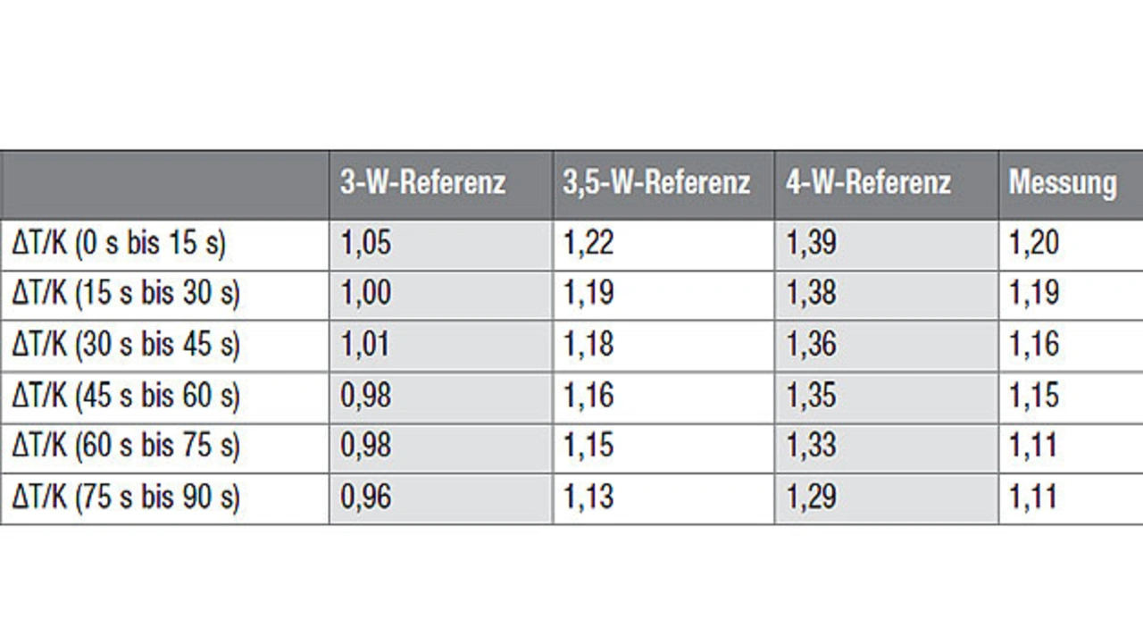 Das Schema für die Referenzextraktion von ES und die kalorimetrische Messung ist in Bild 5 zu sehen. Beim kalorimetrischen Test wird ein 3,3-Ω-Widerstand bei 60 V und einer Schaltfrequenz von 75 kHz und einem Tastverhältnis von zehn Prozent geschaltet. Mithilfe einer Look-up-Tabelle (Tabelle 2) lässt sich die Verlustleistung P durch Vergleich des Temperaturanstiegs für verschiedene Zeitabschnitte mit den Referenzmessungen der Body-Diode schätzen.