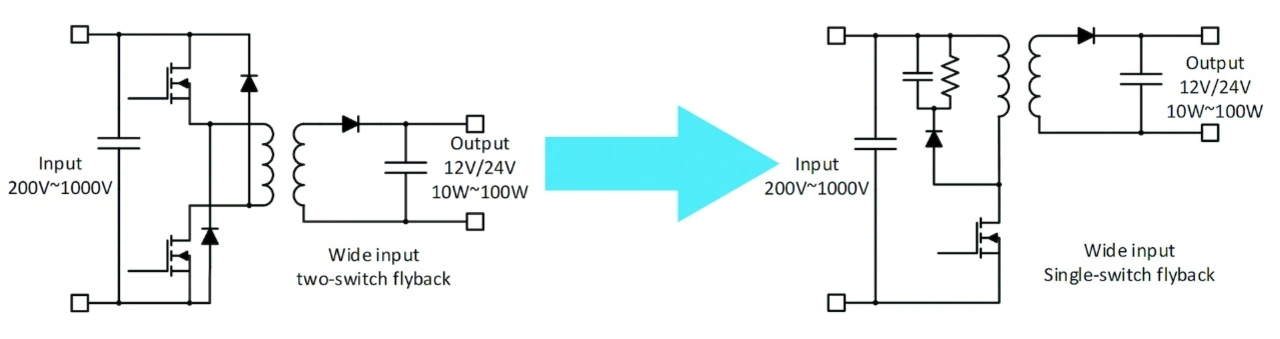 1700-V-SiC-MOSFETs tragen unter anderem durch ihre hohe Durchbruchspannung, ihren geringeren spezifischen Durchlasswiderwiderstand und ihre hohe Schaltgeschwindigkeit dazu bei, Ausfälle von APUs zu vermeiden. In Kombination ermöglichen diese Eigenschaften ein einfacheres Schaltungsdesign unter Verwendung der Sperrwandler-Topologie mit nur einem Schalter (Bild 1). Im Vergleich dazu haben Lösungen auf Siliziumbasis entweder eine zu niedrige Nennspannung für diese Topologie, was eine Architektur mit zwei Schaltern erforderlich macht und das Ausfallrisiko verdoppelt, oder die Entwickler müssen Leistungsfähigkeit für die Nennspannung opfern. Außerdem gibt es nicht von genügend Lieferanten für solche Siliziumkomponenten und sie sind teurer als äquivalente SiC-Bauteile.
