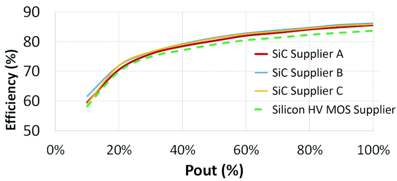 Bild 2 zeigt, wie stark verschiedene SiC-MOSFETs den Wirkungsgrad über die Ausgangsleistung verbessern können. Mit den effizientesten Bauelementen von heute ist es sogar möglich, eine passive Kühlung zu implementieren, d. h. es ist kein Kühlkörper erforderlich.
