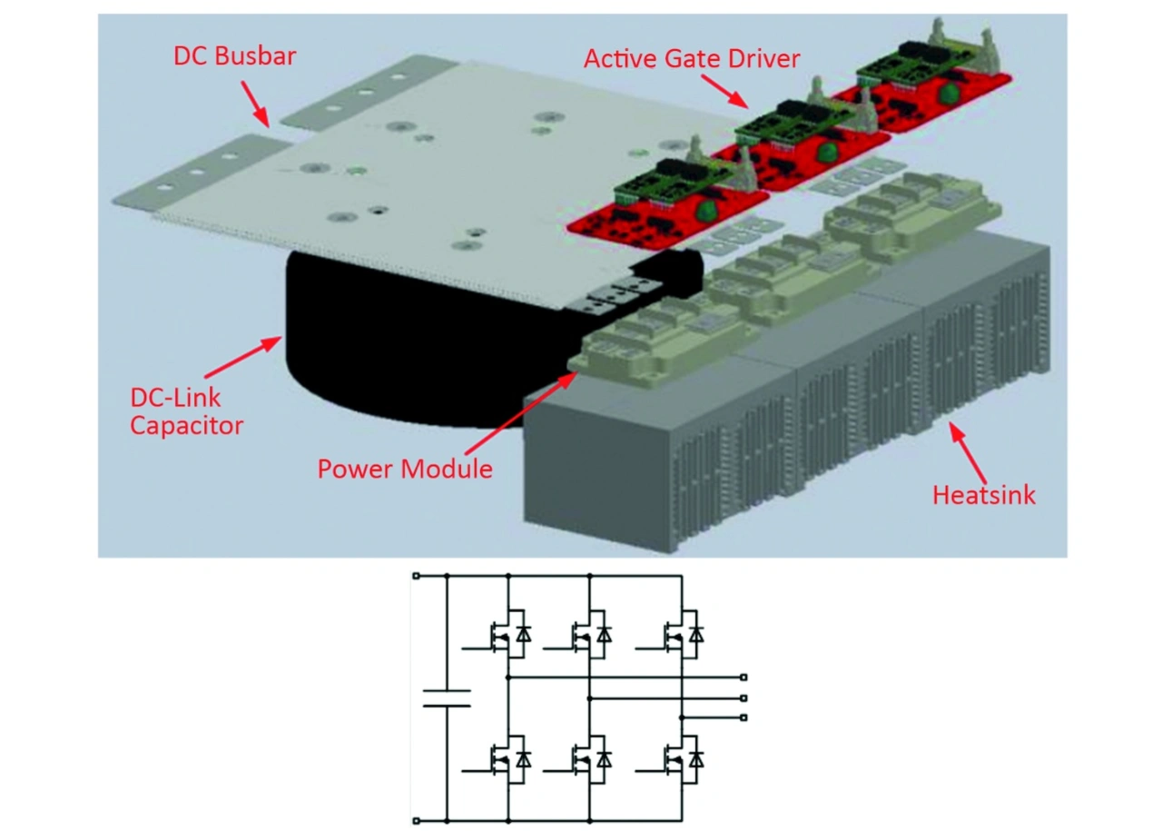 Anwendungen im Megawattbereich reichen von Halbleiter-Transformatoren (Solid-State Transformer, SST) und Mittelspannungs-Gleichstromverteilungssystemen bis hin zu Traktionsaggregaten (TPUs; Traction Power Units) in Nutz- und Schwerlastfahrzeugen. Weitere Anwendungen sind zentrale Solarwechselrichter und Offshore-Windkraftanlagen sowie Energiewandler an Bord von Schiffen. Bild 6 zeigt ein Beispiel für einen modularen mehrstufigen Wandler.