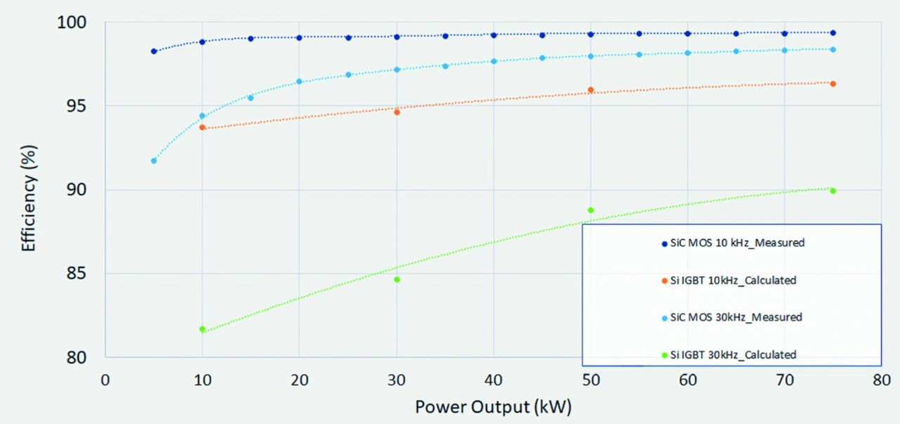 Bild 4 vergleicht den Wirkungsgrad dieses Wechselrichterdesigns mit verschiedenen 1700-V-Leistungsmodulen in einem niederinduktiven Gehäuse. Das SiC-Modul hat einen maximalen Wirkungsgrad von 99,4 Prozent bei 10 kHz. Selbst bei einer Verdreifachung der Schaltfrequenz auf 30 kHz bot das SiC-Modul immer noch einen höheren Wirkungsgrad als der Ansatz mit Si-IGBTs. Dadurch ließen sich die schweren und teuren Filterkomponenten auf ein Drittel ihrer ursprünglichen Größe verkleinern.