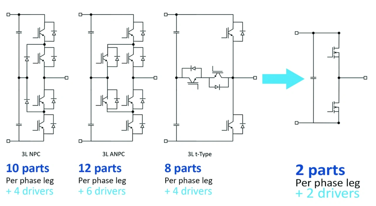 Um den Wirkungsgrad zu maximieren, mussten Entwickler, die Siliziumtransistoren bei diesen hohen Zwischenkreisspannungen einsetzen, traditionell zwischen einigen wenigen komplexen Drei-Level-Schaltungsarchitekturen wählen. Beispiele sind die Dioden-basierte NPC-Schaltung (Neutral Point Clamped), die aktive NPC-Schaltung (ANPC) und die T-Schaltung. Mit dem Einsatz von 1700-V-SiC-MOSFETs in einer Zwei-Level-Schaltung (Halbbrücke) lässt sich die Anzahl von Bauelementen halbieren sowie eine wesentlich effizientere Ansteuerung verwenden.