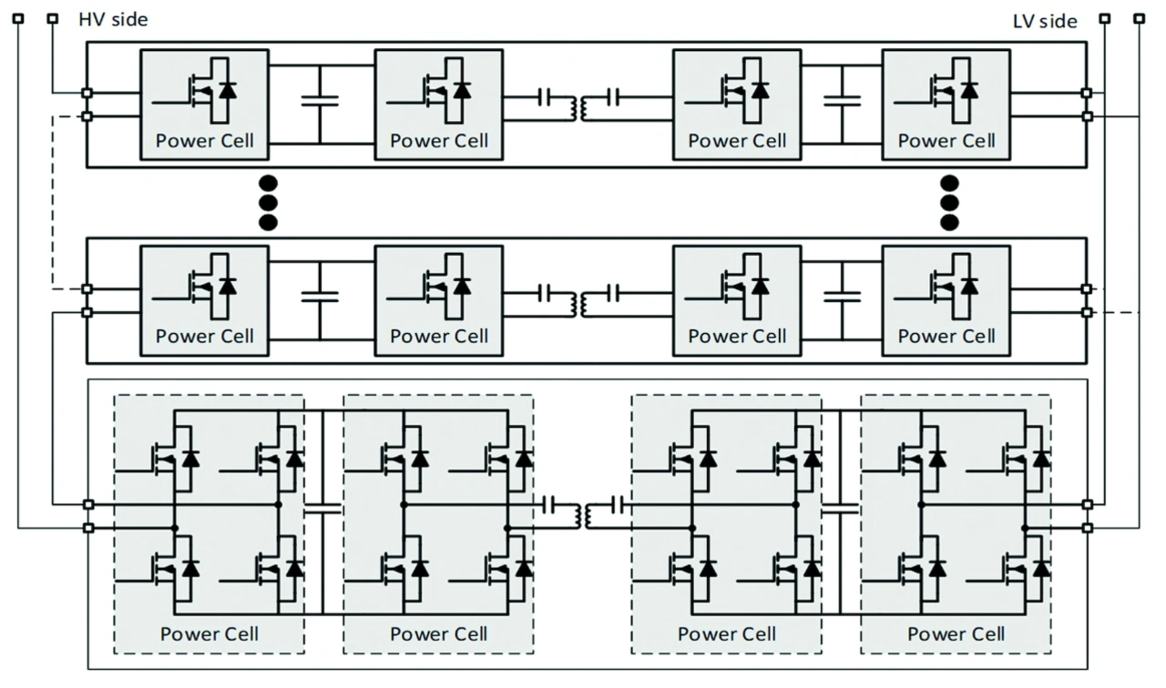 Bei Anwendungen mit solch hohen Leistungen verwendet ein Wandler für einen Halbleiter-Transformator mehrere Stufen in Serie geschalteter Leistungselektronik-Zellen, um die Spannungsanforderungen zu erfüllen. Jede Zelle kann eine Halb- oder Vollbrücke sein. Manche Entwickler entscheiden sich sogar für Drei-Level-Architekturen. Die Verwendung modularer Komponenten auf der Grundlage einer solchen Grundeinheit erhöht die Skalierbarkeit und minimiert den Wartungsaufwand. Diese Einheitszellen, die manchmal auch als Leistungselektronik-Blöcke (PEBB; Power Electronic Building Blocks) oder Submodule bezeichnet werden, sind als kaskadierte H-Brücken-Wandler oder modulare Multi-Level-Wandler (MMCs) konfiguriert.