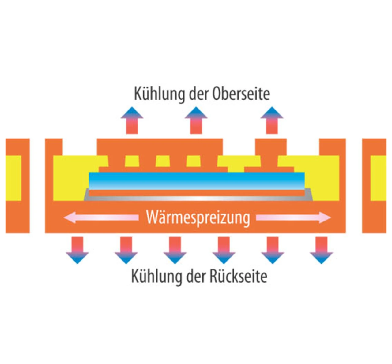 Außerdem ist ein sehr guter Wärmetransfer zur Gehäusevorder- und Rückseite möglich (Bild 3). Die Ergebnisse der Entwicklungen und die Tests der in Einbetttechnik aufgebauten Prototypen bestätigen diesen Gehäusen eine außerordentlich hohe Zuverlässigkeit.