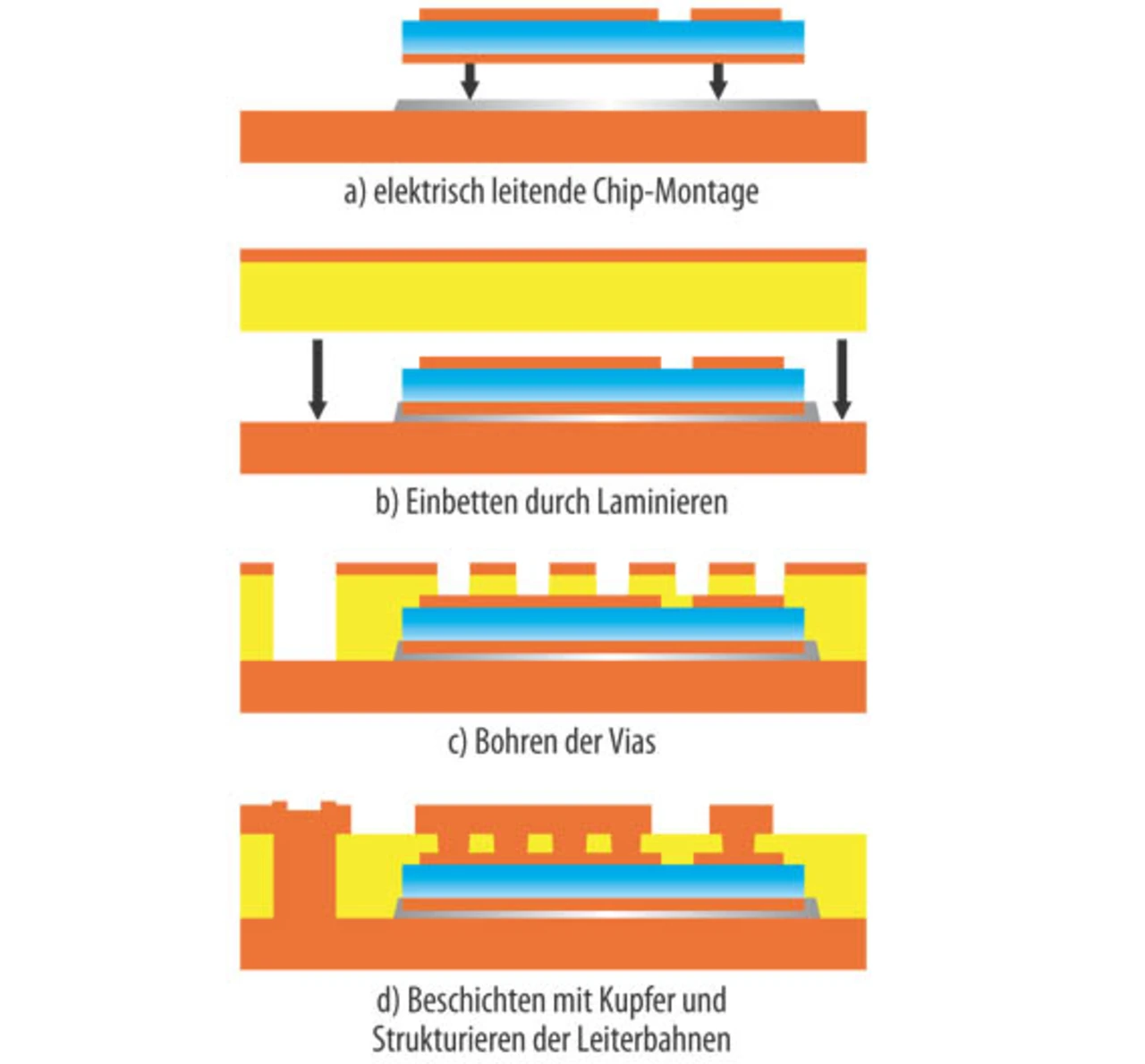 Die Prozessschritte für die Einbettung von Leitungshalbleitern sind in Bild 4 dargestellt. Leistungshalbleiter sind aufgrund des Widerstandes des Siliziums, welcher nur einen Fluss von hohen Strömen vertikal durch das Silizium erlaubt, vertikale Bauelemente. Daher haben sie sowohl auf der Vorderseite als auch auf der Rückseite Kontakte.