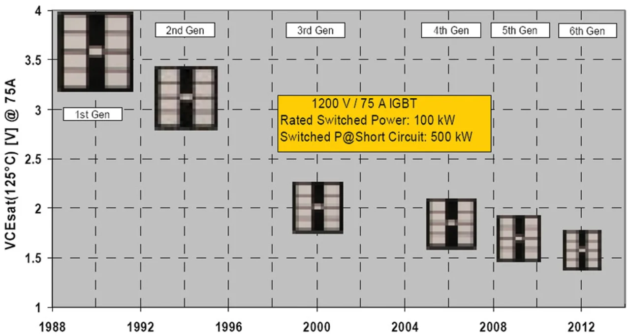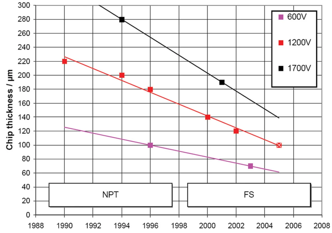 IGBTs gelten als Schlüsselbauelement in diesen Anwendungsgebieten, und diese haben in der letzten Dekade erhebliche Fortschritte bezüglich Verluste in Verbindung mit kleineren Chipgrößen gemacht. Damit ließen sich immer kompaktere und billigere Gehäuse und damit auch Inverter entwickeln (Bilder 1 und 2). Ermöglicht hat diesen Fortschritt die Einführung moderner IC-Techik in den IGBT-Prozess, das heißt kleine planare Transistorzellen sowie auch Trench-Transistorzellen, aber auch evolutionäre Schritte in der Vertikalstruktur von PT (Punch Through) zu NPT (Non Punch Through) und Feldstopp (Bild 3) in Verbindung mit einer anspruchsvollen Dünnwafertechnik.