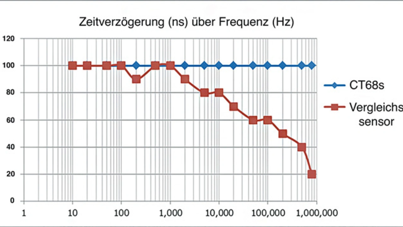 Andere auf dem Markt befindliche Stromsensoren sind in der Regel auf eine geringe Phasenverschiebung bei hohen Frequenzen ausgelegt. Infolgedessen haben diese Stromsensoren keine konstante Zeitverzögerung über den gesamten Frequenzbereich. Dies wird in Bild 2 veranschaulicht, das die Zeitverzögerung eines vergleichbaren, auf dem Markt erhältlichen Sensors darstellt.