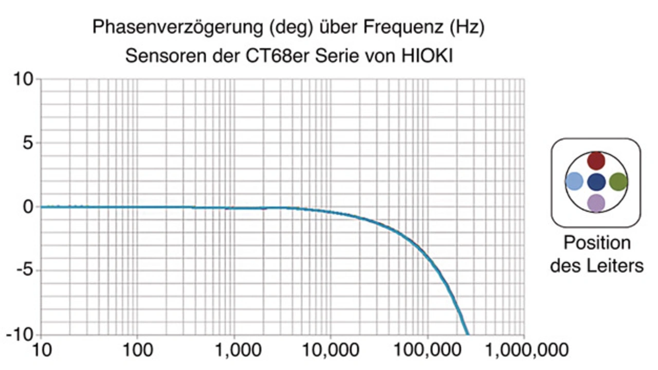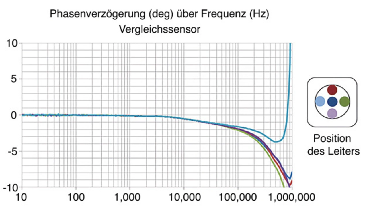 Auch die Positionierung des Leiters im Stromsensor kann die Genauigkeit der Messung beeinflussen. Dies wird in den Bild 3 und 4 dargestellt. In Bild 3 (Hioki-Sensor) liegen alle Kurven genau übereinander, was zeigt, dass die Position des Leiters keinen Einfluss auf die Phasenverzögerung hat.
