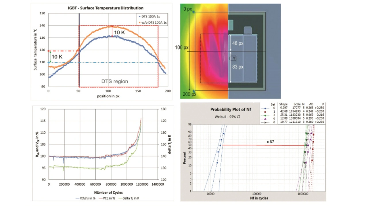 Mit dem Einsatz des DTS und dicken Kupferbonddrähtensteigt die Lebensdauer signifikant. Bei der indirekten Kühlung ohne Bodenplatte (Base Plate) des vorgestellten Testlayouts sinkt die Oberflächentemperatur des IGBT bei einer Belastung mit 136 A um 10 K gegenüber demgegenüber gelöteten und mit Aluminiumdraht gebondeten Aufbauten. Dies bedeutet auch,dass die Lebensdauer um den Faktor 67 steigt (Bild 3). Bei der direkten Kühlung mit einer Systemlötung auf Bodenplatte zeigt sich, dass alle Test-Setups mit DTS die Lebensdauer nach dem CIPS2018-Modell um den Faktor 6 bis 10 erhöhen und dass die bodenplattenlosen Aufbauten eine höhere Lebensdauer erwarten lassen als die mit Bodenplatte. Dabei muss beachtet werden, dass die Aufbauten mit Bodenplatte mit 197 A fast 50 Prozent mehr Strom vertragen mussten (und konnten), um im Test den gleichen Temperaturhub zu erzielen.