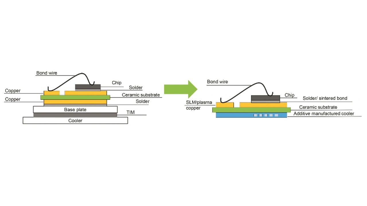 Darunter fallen die Temperaturfestigkeit (über +200 °C), niedriger Wärmewiderstand, hohe Stromtragfähigkeit durch Dickkupfer, Widerstandsfestigkeit gegen Korrosion und kleinerer Unterschied der Wärmeausdehnungskoeffizienten (Bild 9). Als Testvehikel nutzen die Forscher eine SiC-Diode für 3,3 kV mit einer Stromdichte von 100 A/cm². Die verschiedenen Prozessschritte wurden evaluiert, wofür sich sowohl das Löten als auch beidseitiges Sintern eignet. Im Test arbeitete die Diode bis +250 °C einwandfrei.