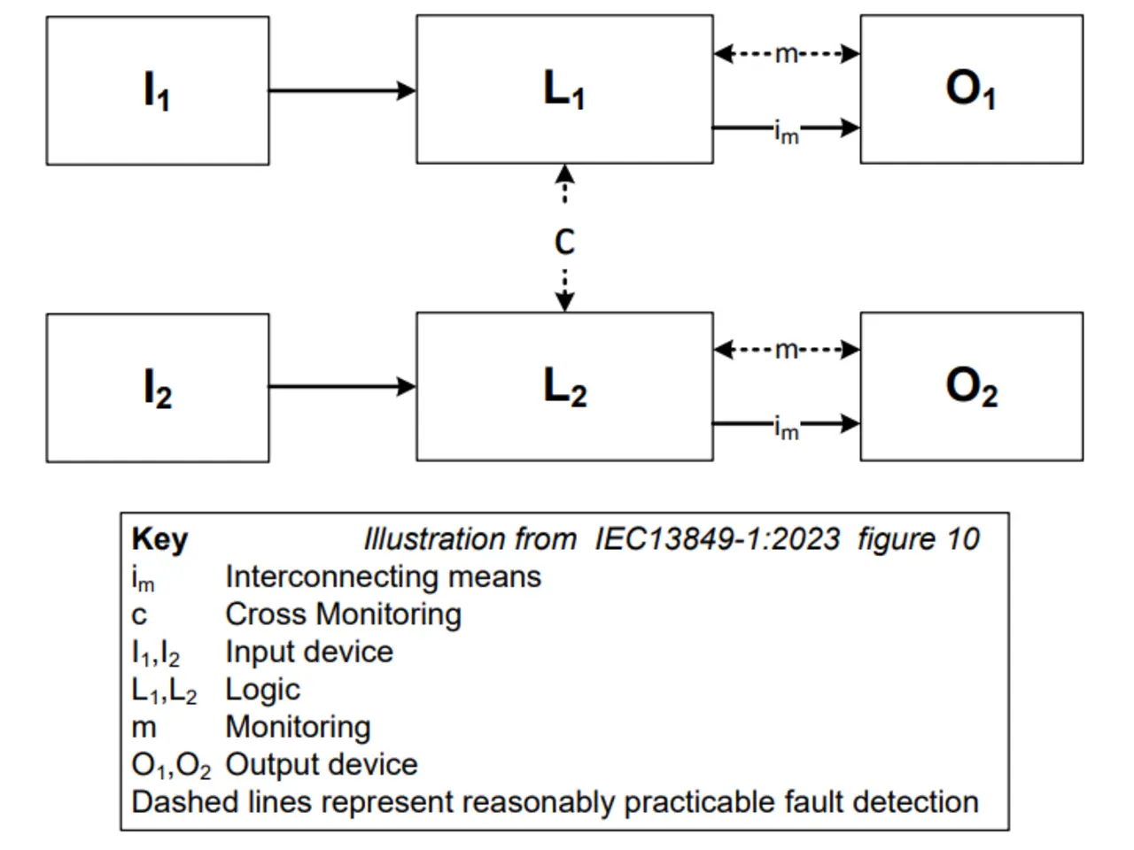 Bei der Planung künftiger Designs kommt es auf die Wahl von Bauelementen an, die die Functional-Safety-Zertifizierung erleichtern. Normen wie etwa ISO13482, ISO10218 oder ISO 3691-4 bieten einen Ausblick auf das, was hinsichtlich der Sicherheitsanforderungen an humanoide Roboter künftig zu erwarten ist. Beide Klasse-C-Standards (ISO10218 und ISO3691-4) beziehen sich auf die Norm ISO13849, die besagt, dass das System PLd-konform sein muss, jedoch überlässt die Norm ISO3691-4 die Architektur dem Entwickler, während die Norm ISO10218 eine CAT3-Architektur vorschreibt. Legt man das Worst-Case-Szenario aus diesen Normen zugrunde, muss für einen humanoiden Roboter mindestens CAT3 PLd angewandt werden. Die in Bild 6 gezeigte Safety-Architektur muss ein CAT3-System implementieren.