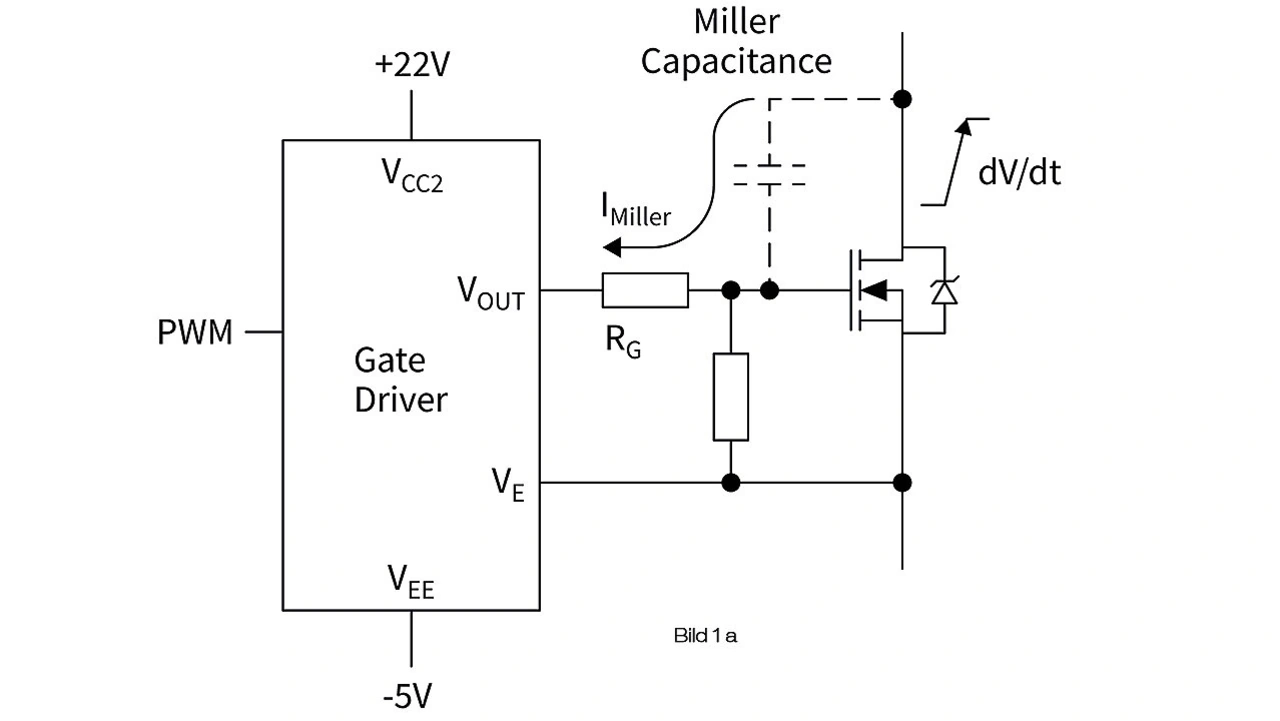 Wird beispielsweise in einer Halbbrücke der untere Transistor ausgeschaltet und der obere eingeschaltet, injiziert die Miller-Kapazität des unteren Schalters zwischen dem Kollektor/Drain und dem Gate einen Strom in dessen Gate. Jeder Serienwiderstand zwischen dem Gate und der Treiberschaltung führt zu einer Spannung, die im schlimmsten Fall dazu führen kann, dass der Schalter wieder einschaltet. Obwohl IGBTs und MOSFETs selbstsperrend sind, also bei einer Gate-Source- bzw. Gate-Emitter-Spannung von 0 V nominell ausgeschaltet sind, verwenden Gate-Treiber-Schaltungen häufig eine negative Spannung, um sicher auszuschalten (Bild 1a). Diese reicht von −5 V für MOSFETs bis zu −7 V für IGBTs, um dem durch den Gate-Widerstand verursachten Spannungsanstieg entgegenzuwirken.