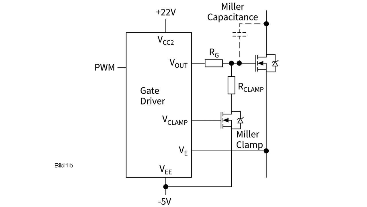 Diese Lösung ist praktikabel, erfordert jedoch eine zusätzliche Versorgungsspannung, die im übrigen Design möglicherweise nicht benötigt wird. Um dies zu vermeiden, eignet sich eine Miller-Clamp-Schaltung. Durch die Einführung eines zusätzlichen MOSFETs zwischen Gate und Emitter bzw. Source wird die Gate-Spannung des Leistungsschalters geklemmt, nachdem das Ansteuersignal unter einen bestimmten Wert gesunken ist (Bild 1b). Nachdem sich die Kollektor- bzw. Drain-Spannung auf ihrem Aus-Zustand stabilisiert hat, kann dieser Klemmschalter wieder deaktiviert werden. Dieser Zeitpunkt ist nicht besonders kritisch, muss aber vor dem nächsten Einschalten des Leistungstransistors abgeschlossen sein.