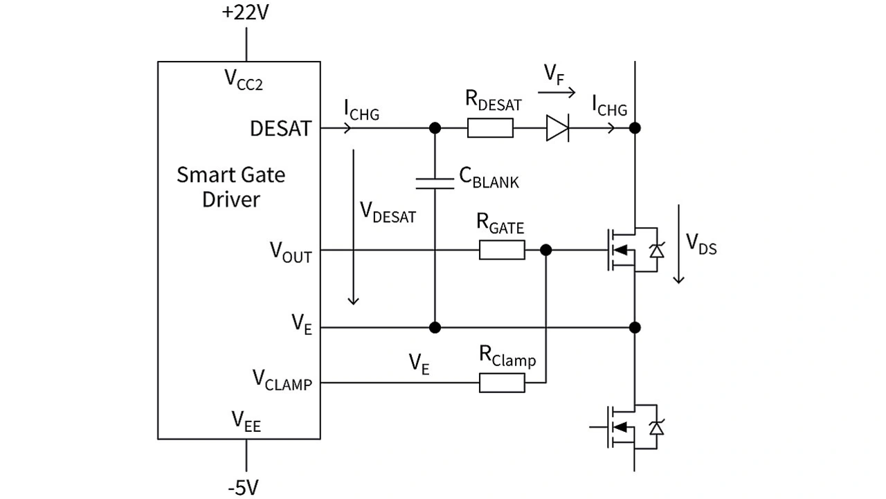 Eine Zener-Diode schützt den DESAT-Pin, indem sie die Spannung auf ein für den Gate-Treiber sicheres Niveau absenkt, während eine Schottky-Diode das Signal unter das Massepotenzial absenken kann.