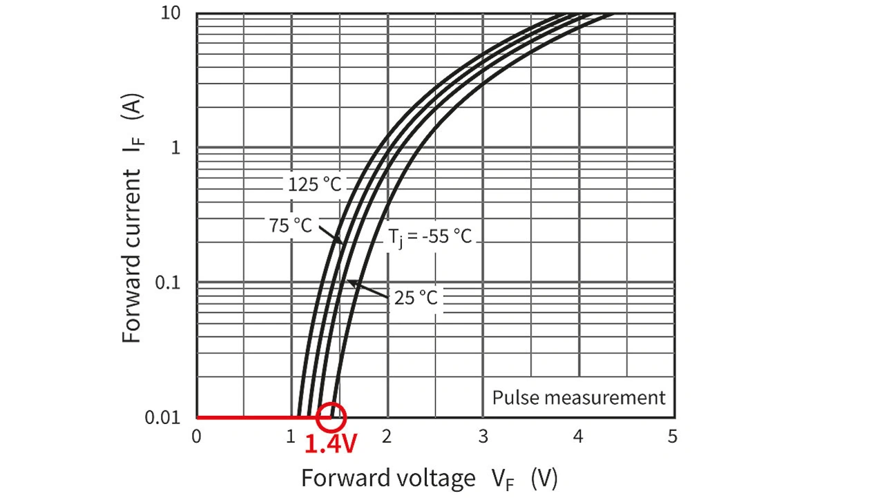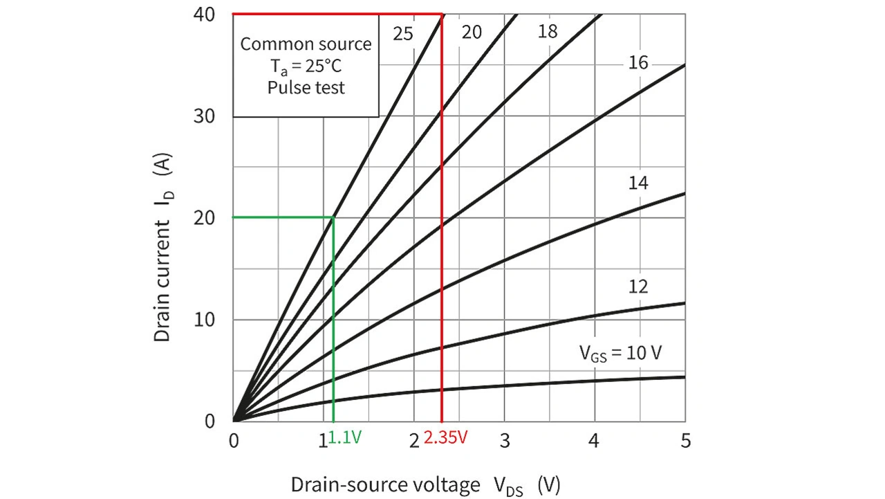 Bild 3a zeigt die Ausgangkennlinie für den SiC-MOSFET TW070J120B von Toshiba. Bei einer Gate-Source-Spannung UGS von 25 V und dem normalen Drain-Strom ID von 20 A beträgt die Drain-Source-Spannung UDS 1,1 V (grün), beim maximalen ID von 40 A liegt der Wert bei 2,35 V (rot). Der nächste Schritt besteht darin, die Vorwärtsspannung UF für die ausgewählten Dioden zu ermitteln. Für zwei Fast-Recovery-Dioden des Typs CRF03A von Toshiba ergeben sich 2 × 1,4 V (Bild 3b).