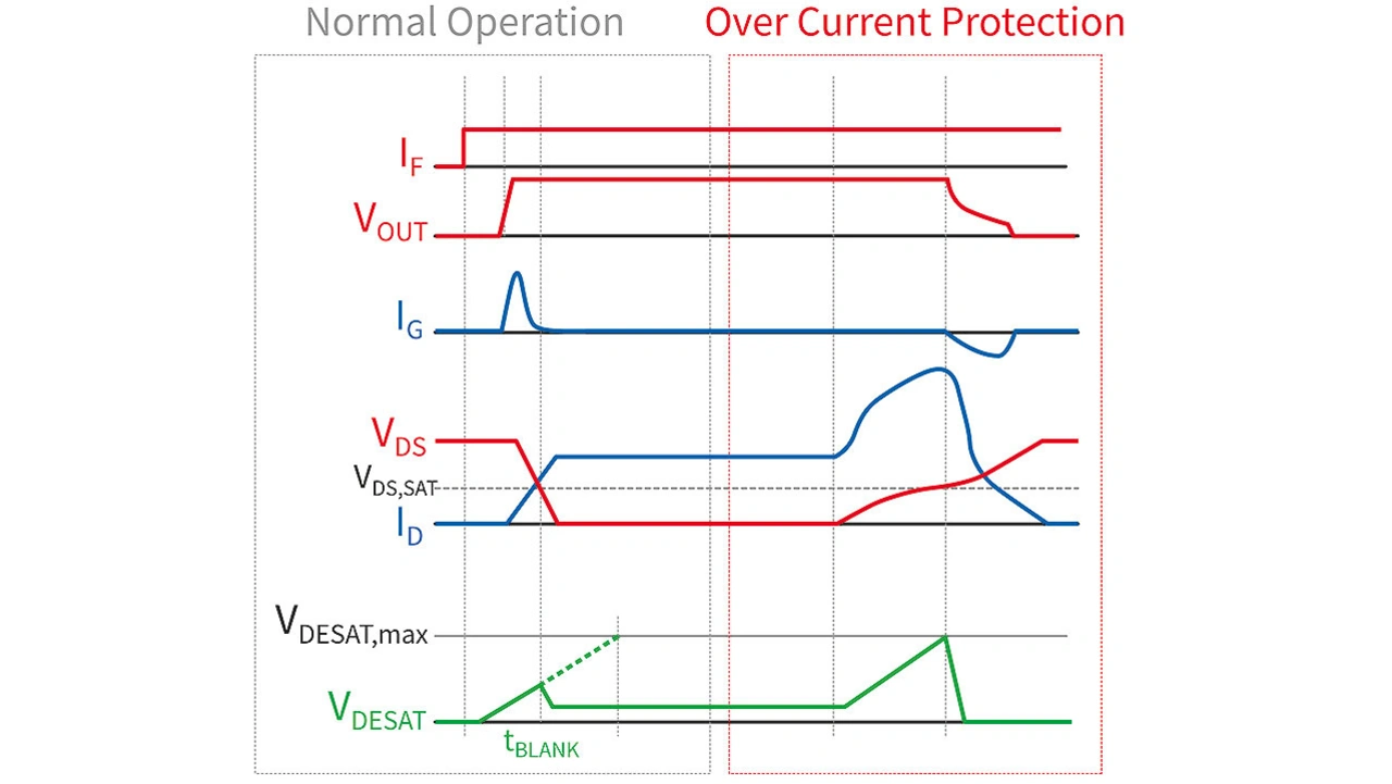 Bei einem Kurzschluss oder wenn die angelegte Gate-Treiber-Spannung nicht hoch genug ist, um den Leistungsschalter vollständig in den Sättigungsbereich zu bringen, kann der Transistor zerstört werden. Über eine Entsättigungserkennung (DESAT), die die Kollektor- bzw. Drain-Spannung während des eingeschalteten Zustands überwacht, kann die Treiberschaltung den Schalter wieder ausschalten, sollte eine vordefinierte Schwellenspannung überschritten werden. Da die Kurzschlussfestigkeit bestenfalls bei einigen Millisekunden liegt, muss dieser Mechanismus sehr schnell reagieren. Bei Bauelementen, die mit vielen Kilohertz und in einer elektrisch störbehafteten Umgebung arbeiten, ist dies jedoch eine große Herausforderung.
