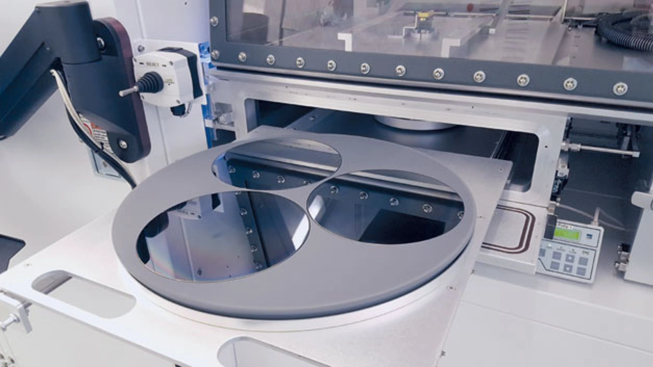 Das Wachstum der (Al)GaN-Schichten erfolgt bei Temperaturen von 800 °C für GaN bis 1200 °C für AlGaN. Da viele der Halbleitereigenschaften stark von der Temperaturkontrolle im Wachstumsreaktor abhängen, kommen den Reaktoren ein entscheidender Einfluss zu. Hier profitiert man sehr von den Fortschritten in der Optoelektronik, denn erst dadurch wurde es möglich, über GaN als Leistungselektronik-Material zu diskutieren. Das Multiwafer-Wachstum aus Bild 2 (drei 8-Zoll-Wafer werden parallel gewachsen) reduziert dabei die Kosten.