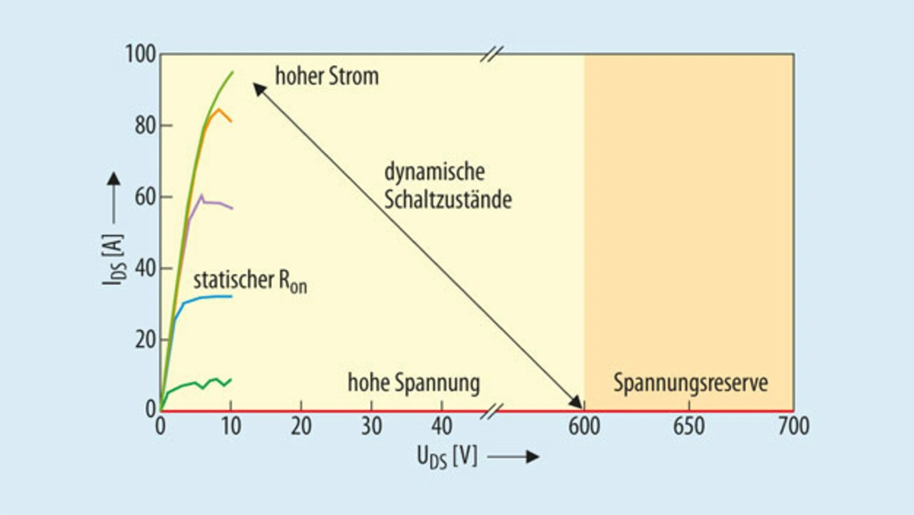 Dieses Problem wird heute, wie in Bild 3 gezeigt, durch eine eingebaute Spannungsreserve von erheblichem Ausmaß jenseits der Betriebsspannung gelöst. In der Diskussion sind weiterhin die Testmethoden der Zuverlässigkeit. Qualifikationen nach JEDEC-Standard werden angeboten, jedoch von den Anwendern nicht als ausreichend empfunden. Es entwickeln sich neue Methoden und Standards: Zusätzliche Tests werden beispielsweise den Ausfallmechanismen des neuen Bauelements gerecht. Sinnvoll sind hier zusätzliche Charakterisierungen in den spezifischen Schaltszenarien der Anwendung.