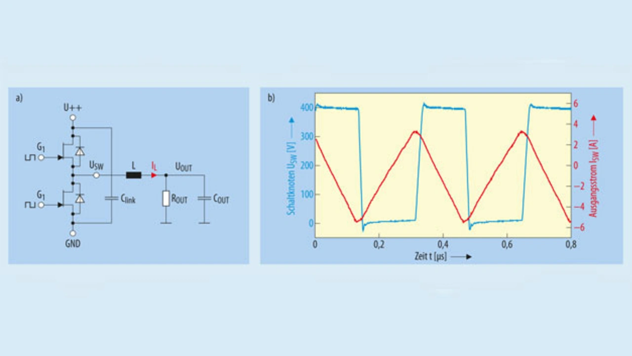 Ein weiteres Beispiel ist die Integration einer monolithischen Halbbrücke. Die integrierte Schaltung erreicht ein besseres Schaltverhalten durch reduzierte Parasitäten, eine erhöhte Zuverlässigkeit und geringere Herstellungskosten für die Aufbau- und Verbindungstechnik. Das Fraunhofer-Institut für angewandte Festkörperphysik IAF hat eine monolithisch integrierte Halbbrücke der 600-V-Klasse entwickelt. Der Betrieb wurde in einem weich schaltenden Abwärtswandler bei einer Schaltfrequenz von 3 MHz, einer Eingangsspannung von 400 V und einer Ausgangsleistung von bis zu 250 W demonstriert [3], [4], siehe Bild 5.