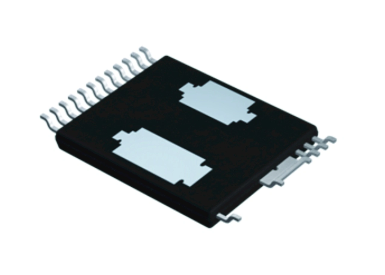So vereinfachen die integrierten Halbbrücken von BridgeSwitch die Entwicklung und Produktion von umrichtergesteuerten, ein- oder dreiphasigen Antrieben für Permanentmagnet- (PM) oder bürstenlose (BLDC) Hochspanungs-Gleichstrommotoren. BridgeSwitch-ICs enthalten ein proprietäres momentanes Phasenstrom-Ausgangssignal, das die Entwicklung von sensorlosen Steuerungen erleichtert. Diese ICs enthalten zwei 600-V-N-Kanal-Leistungs-FREDFETs mit High-Side- und Low-Side-Treibern in einem oberflächenmontierten Small-Outline-Gehäuse (13,6 mm × 9,4 mm und 1,35 mm hoch), das erweiterte Kriechstrecken bietet und die Kühlung der beiden Leistungs-FREDFETs über die Leiterplatte ermöglicht (Bild 2).