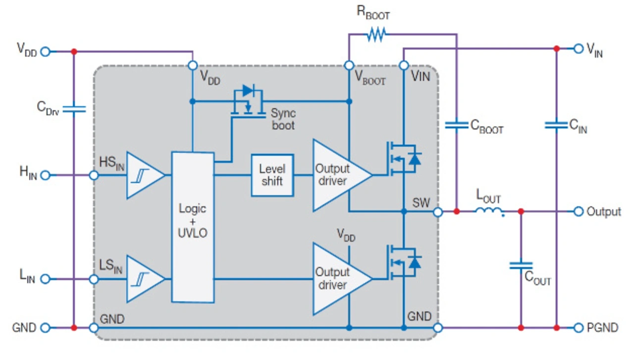Beim Betrieb als Abwärtswandler von 48 V auf 12 V (Bild 1) bei einer Schaltfrequenz von 1 MHz erreicht die Lösung einen maximalen Wirkungsgrad von über 96 %. Gleichzeitig nimmt sie laut Hersteller auf der Leiterplatte 33 Prozent weniger Platz ein als eine entsprechende Implementierung mit mehreren diskreten Chips.