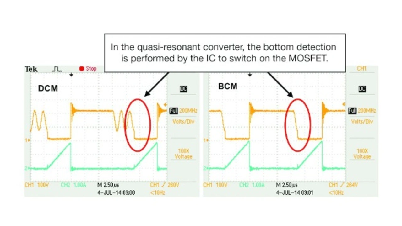 Der quasiresonante Betrieb reduziert die Verlustleistung während langsamer Schaltvorgänge, wenn kein Strom fließt. In diesem Betriebsmodus variiert die Schaltfrequenz bei unterschiedlichen Lastbedingungen. Der Betrieb wechselt bei niedriger Lastin den lückenden Betrieb (Discontinuous Conduction Mode, DCM) und die Schaltfrequenz steigt. Ab einer bestimmten Last geht der Betrieb in den Grenzleitungsmodus (Boundary Conduction Mode, BCM) über und die Schaltfrequenz nimmt mit steigender Last ab. Bild 1 zeigt die Signalverläufe im BCM und DCM.