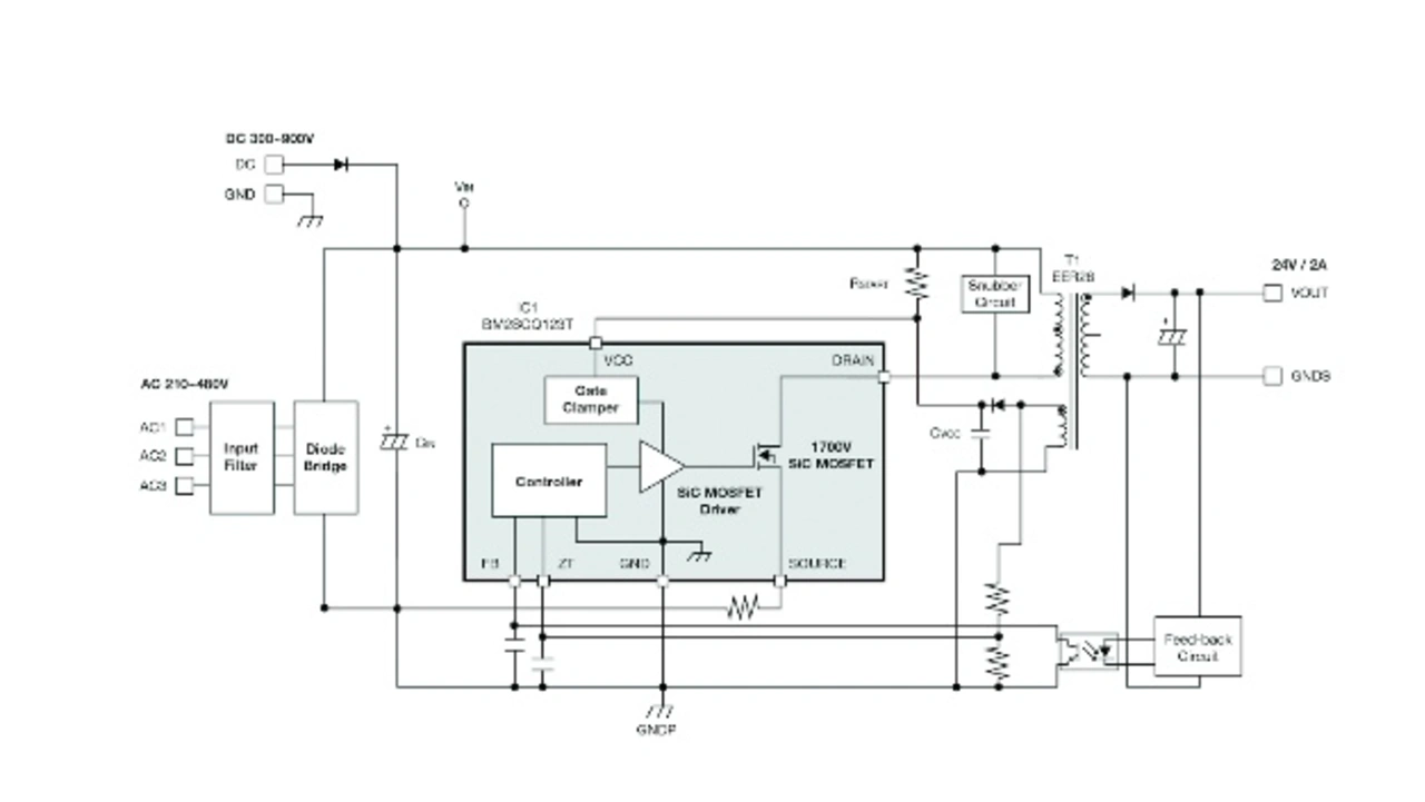 Der integrierte 1700-V-SiC-MOSFET gewährt in industriellen Anwendungen mit dreiphasiger Eingangsspannung verschiedene Vorteile, durch die sich der Wirkungsgrad steigernlässt. Auch die Verlustleistung, die durch den hohen Leitungsstrom auf der Primärseite des isolierten Transformators entsteht, sinkt durch die hohe Eingangsspannung. Dieser ist besonders in Hilfsstromversorgungen von Vorteil, in denen ein höherer Wirkungsgrad gefordert ist.
